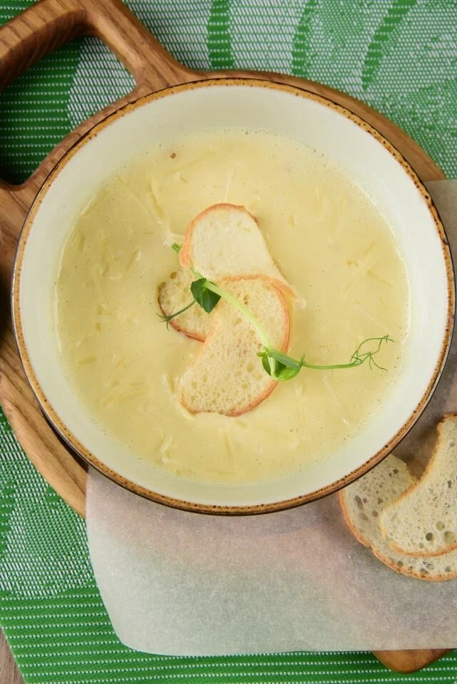 нежный сливочный суп с насыщенным сырным вкусом, дополненный хрустящими золотистыми крутонами
